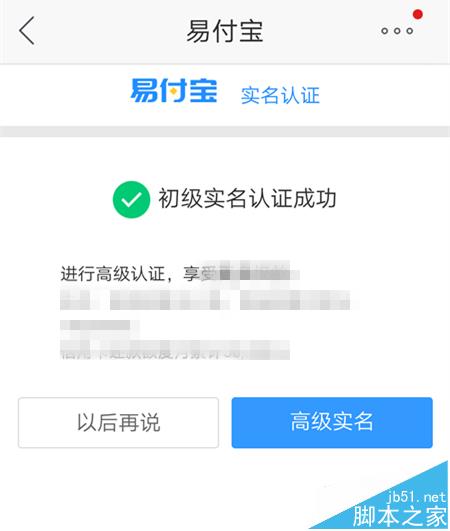 2、选择“易付宝管理”,进入易付宝,输入你的姓名和身份证号,点击下一步。进入易付宝-实名认证界面。