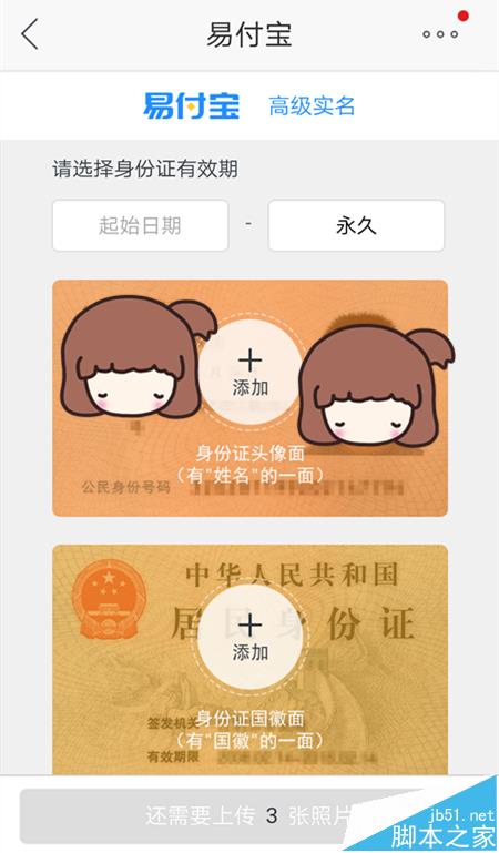5、你可以继续点击高级实名,高级实名需要上传你的身份证的正反面,选择身份证的起始日期,分别点击+正面反面,按照要求完成。