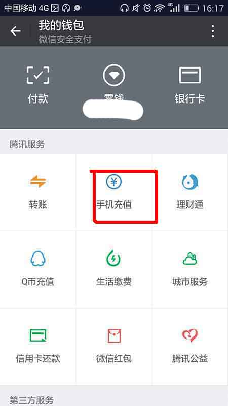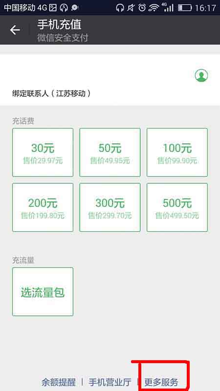 3、点击“手机充值”,在右下角有个“更多服务”,点击进入,如下图所示。