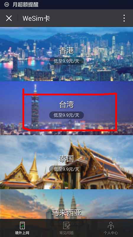 4、看到WeSim卡,点击WeSim卡,有泰国、马来西亚、印度尼西亚、越南、中国香港、中国台湾这几个地区可以选择,如下图所示。