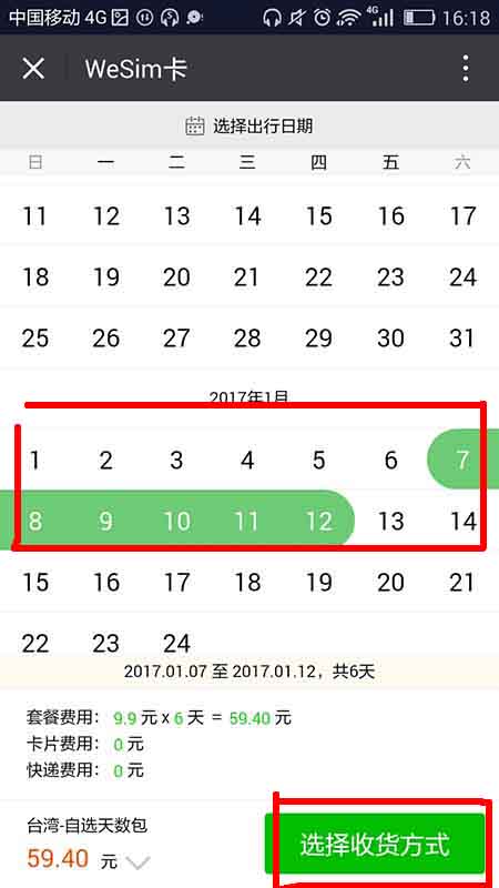 6、选择要出去的日期时间,点击右下角“选择收货方式”,如下图所示。