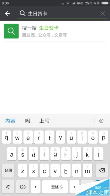 2、点开搜索符号后,在上面输写:”生日贺卡“,然后点搜一搜。