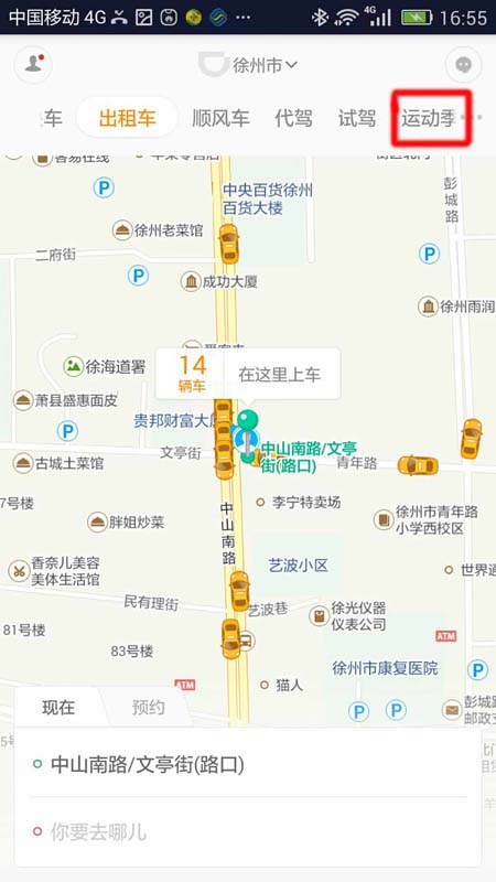 1)下载并打开滴滴出行app,看到上方有“出租车”、“快车”、“代驾”“运动季”等。(如下图)