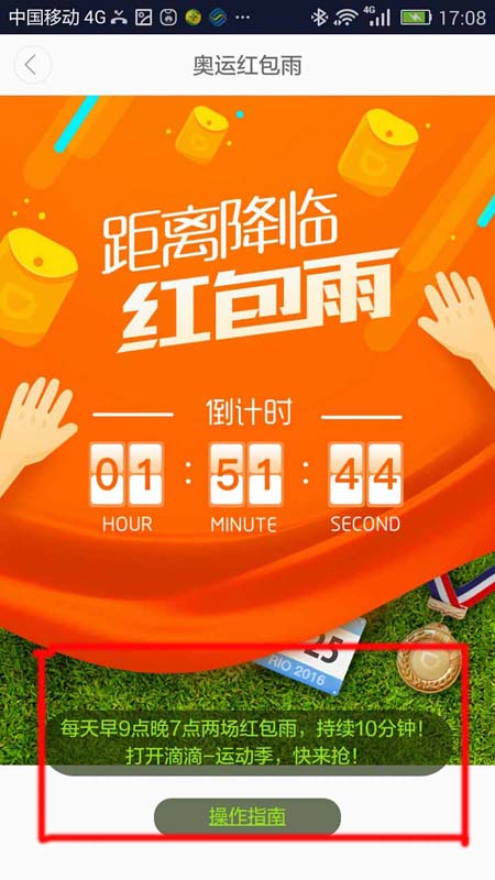 还有一天半,里约奥运会就开始了,滴滴出行开设了红包雨的活动供网友们抢夺,那么我们该如何领取滴滴的红包呢,下面就让脚本之家小编来教你们滴滴出行领取奥运红包礼包方法吧!