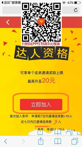 PP红包达人资格首次加入条件:申请前7日内邀请徒弟数>10人,近七日内已邀请徒弟数:9 人 。