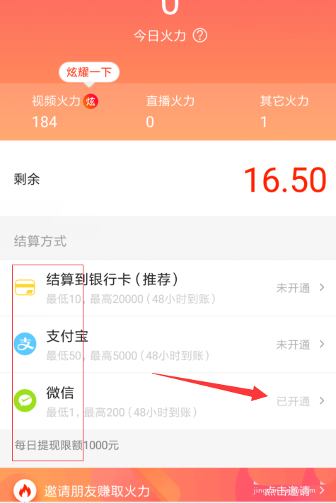 3、这个是我们剩余的没有提现的火力,然后下方有三种提现方式,支付宝,银行卡和微信,有不同的金额要求。