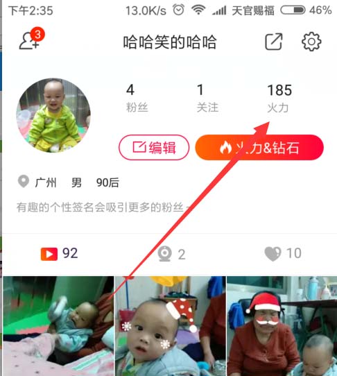 2、这个界面查看自己发布的视频和自己的个人资料,点击上方的火力,如图所示。