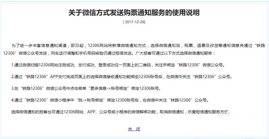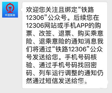 2、通过“铁路12306”APP支付完成页面上的选择微信接收通知功能绑定12306账号后,在微信中关注“铁路12306”公众号。