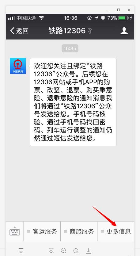 3、在“铁路12306”微信公众号中点击菜单“更多信息->账号绑定”绑定12306账号。