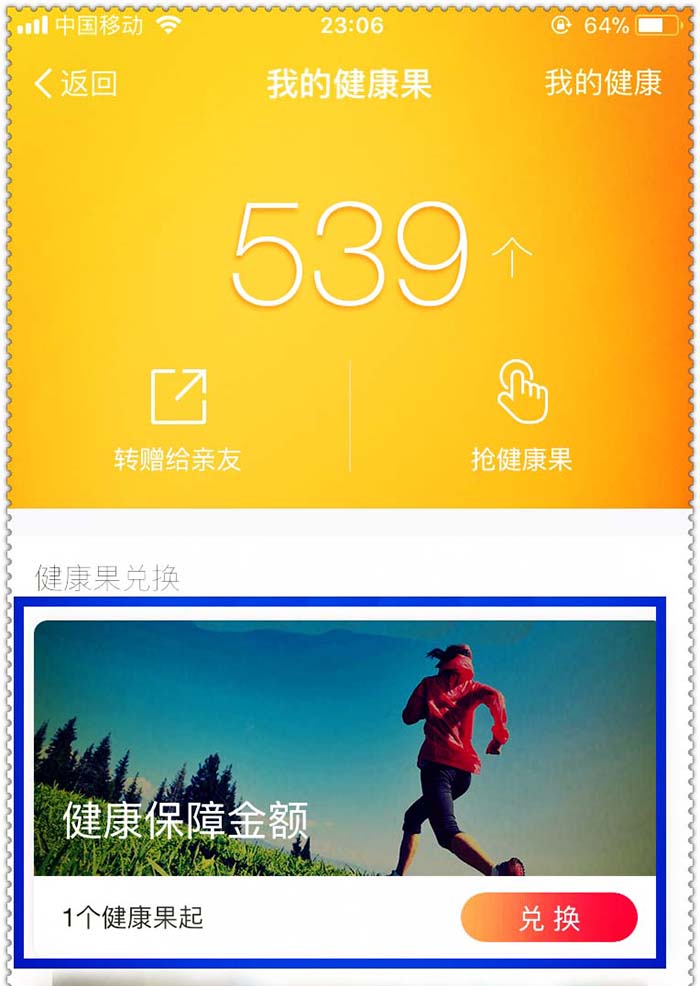4、点击健康果数量,进入详细的兑换界面,在这个界面中第一个即为健康保障金额兑换,点击兑换。