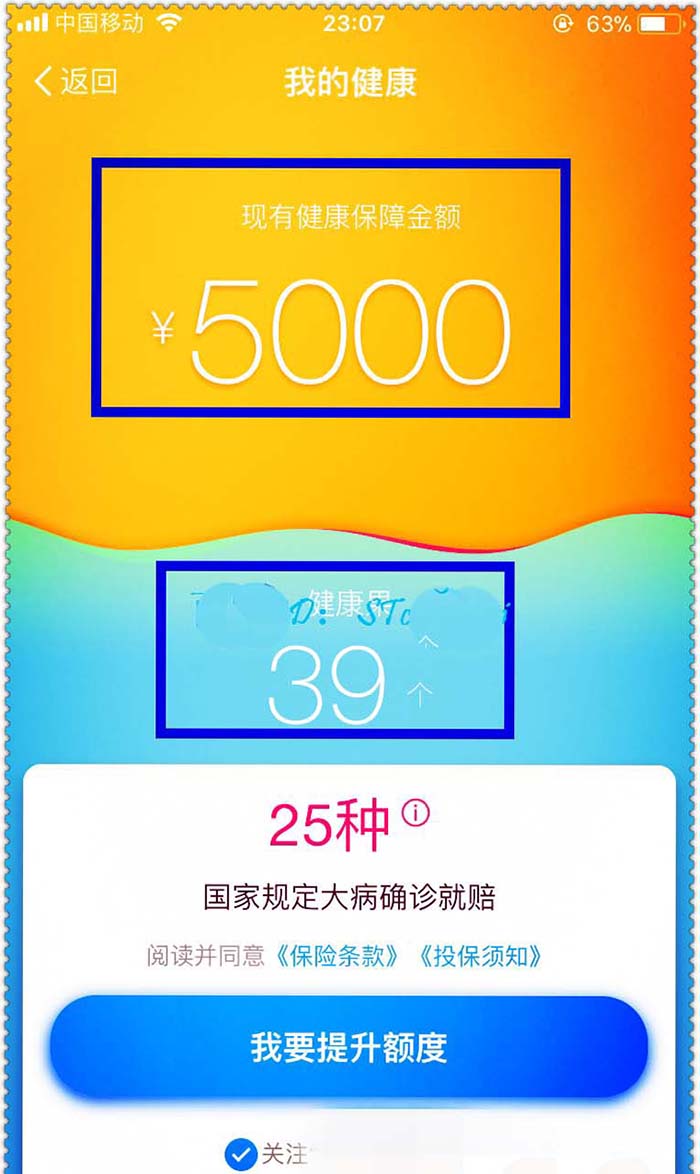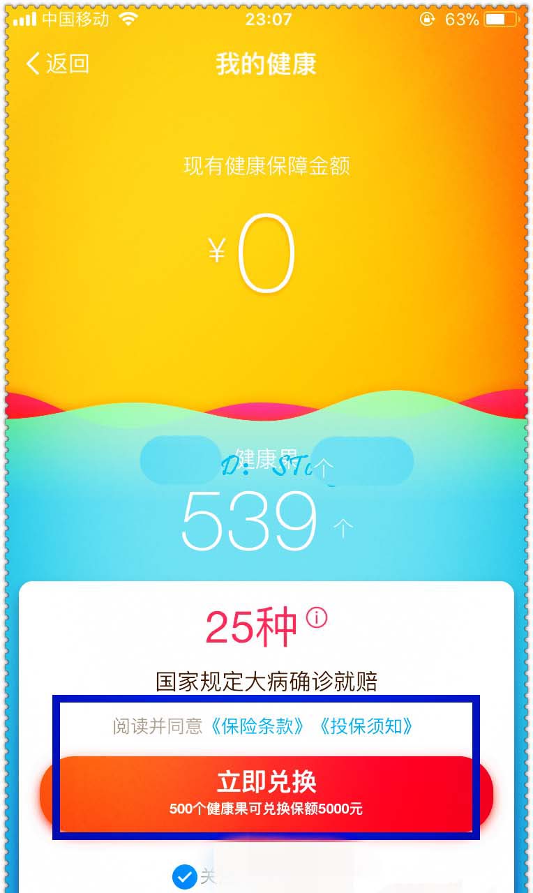 5、这个健康保障金额,从1个健康果开始兑换,最多到500,而对应的保额从10-5000,最大免费额度即可5000,限制为本人保障。
