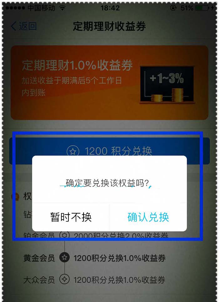 3、在蚂蚁会员界面,可以看到底下有精品应用,有个定期收益券,可以点这里进入兑换,也可通过“理财特权”里兑换。目前有的是1200积分兑换的收益,不同等级的蚂蚁会员获得的收益是不一样,详细参考说明。