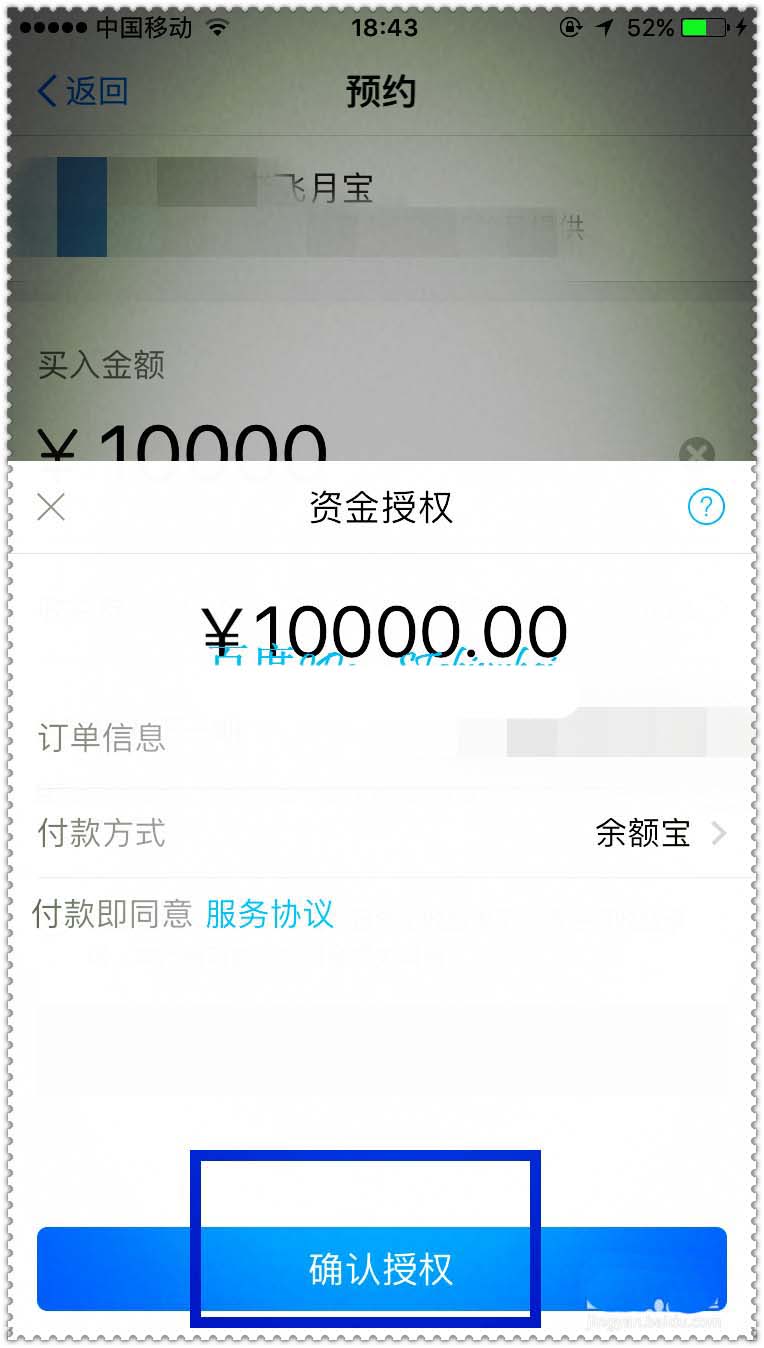 6、最后会弹出确认授权的界面,点击确认,需要输入支付密码或安全验证指纹,然后会弹出预约信息,在定期界面就可以看到这个预约,关注进度,到期后会自动返回,挺不错的。