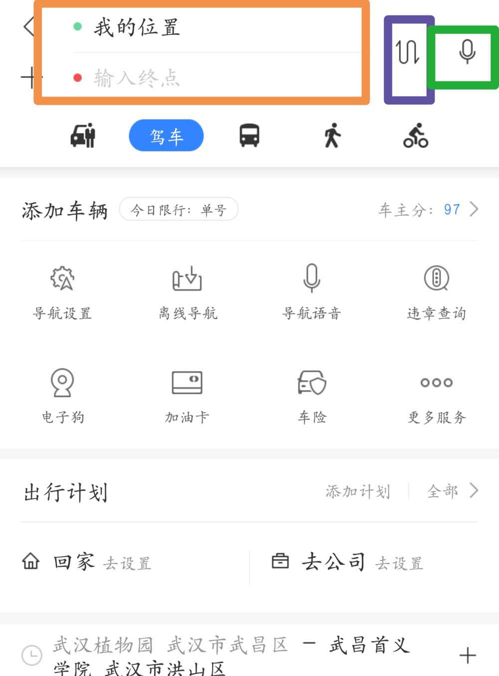 3、在橙色方框中输入自己的起点和想要到达的终点。紫色框中标志功能是一键调换起点和终点。绿色方框的麦克风图标是语音输入。