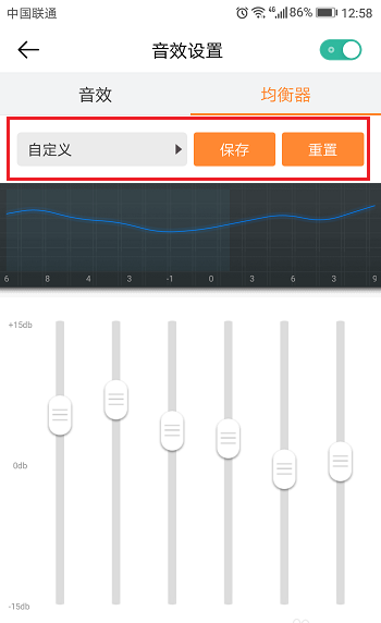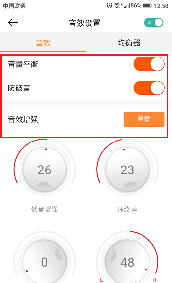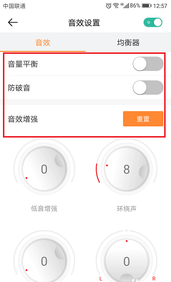 4、在设置音效的时候,可以将音量平衡,防破音开启,设置低音增强,环绕音等,如下图所示: