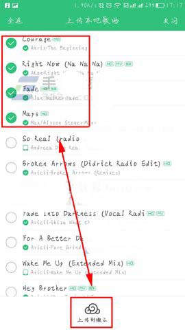 2)随后再点击【上传本地音乐】选项,然后勾选好要上传的歌曲后点击下面的【上传的微云】。(如下图)