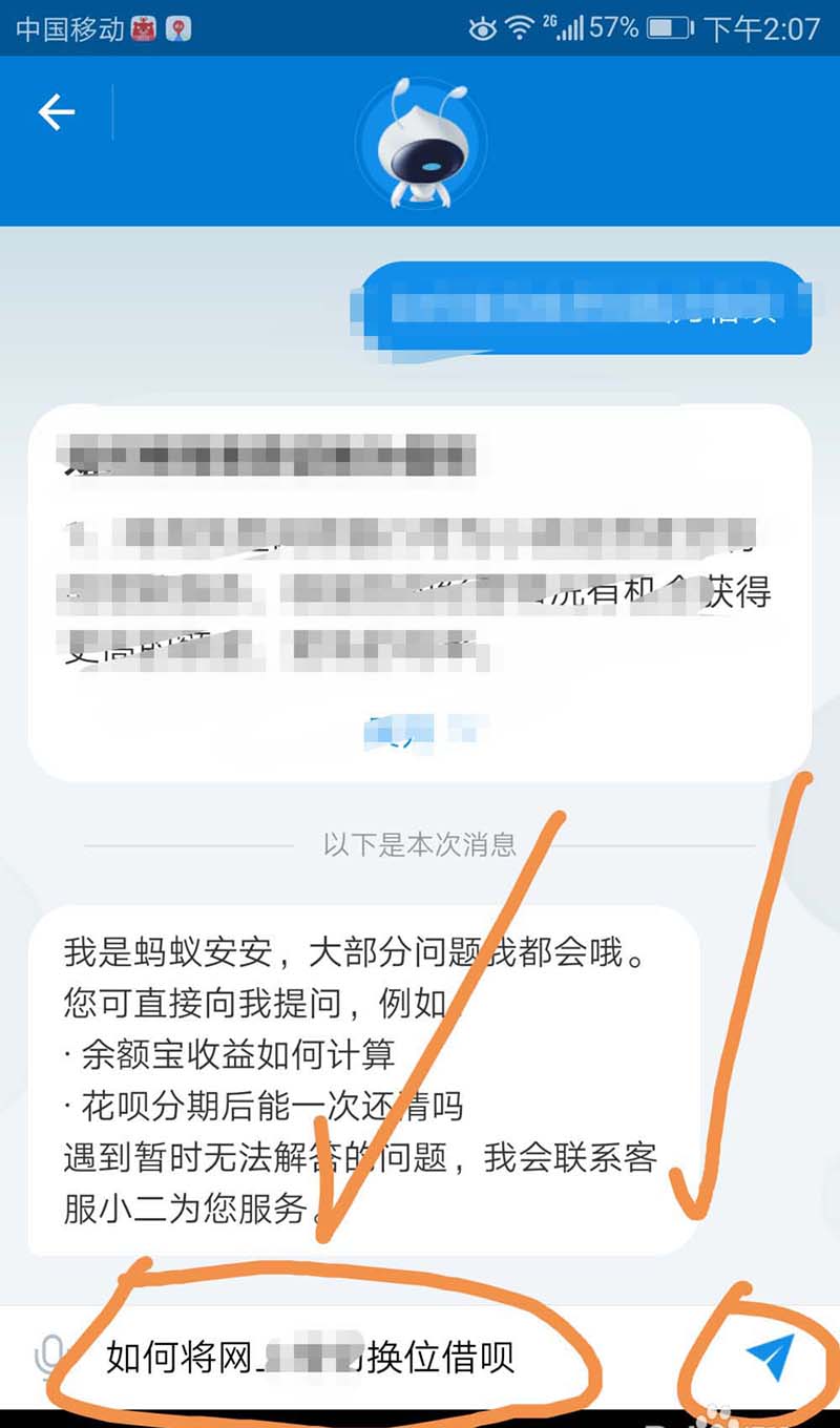 3、在界面下方的箭头指向的搜索框中输入如何将网商贷切换为借呗,然后点按右下方箭头指向的标志。