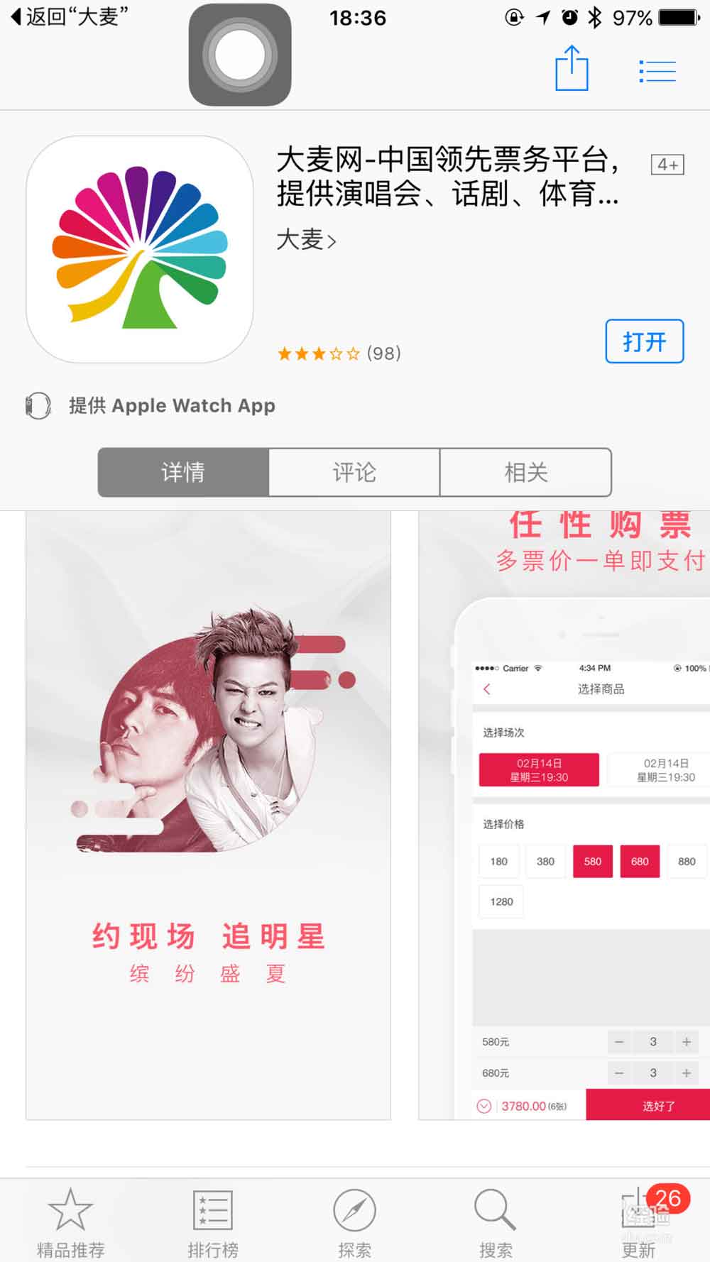 1、在脚本之家或手机上下载大麦客户端
