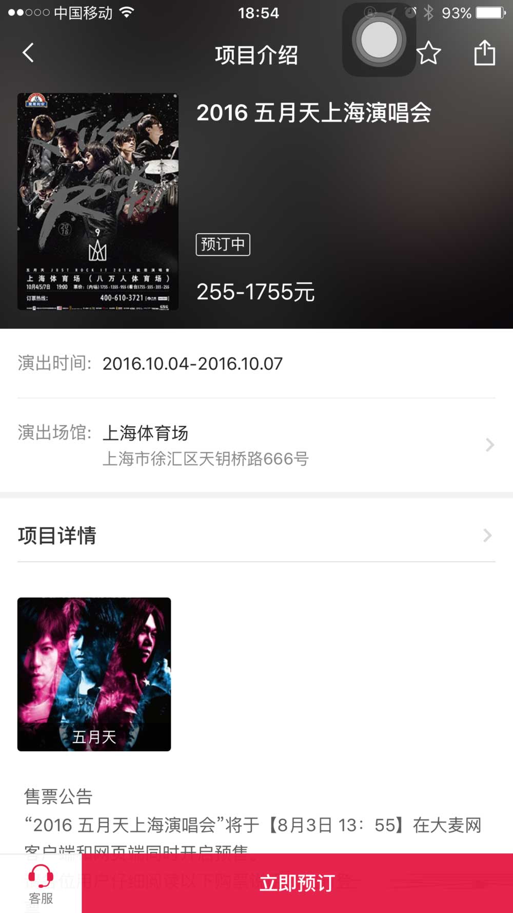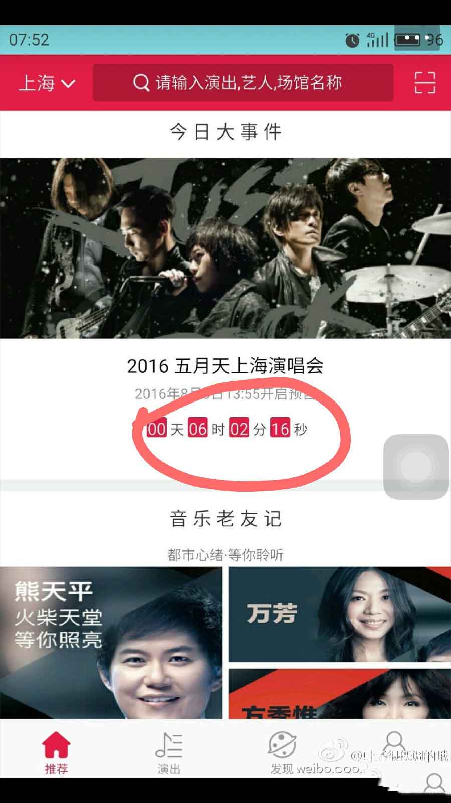 6、首先在大麦首页搜索找到你需要抢票的演唱会,接近抢票时间会出现一个倒计时页面,以五月天演唱会为例,请注意红圈圈住的部分