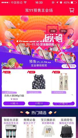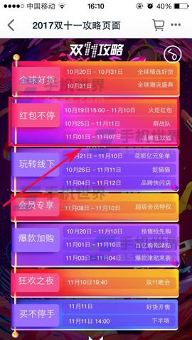 1)打开天猫,在默认页面点击预售好货抢先购的【攻略】,会进入双十一攻略页面,向上滑动一页,然后点击【红包不停】;(如下图)