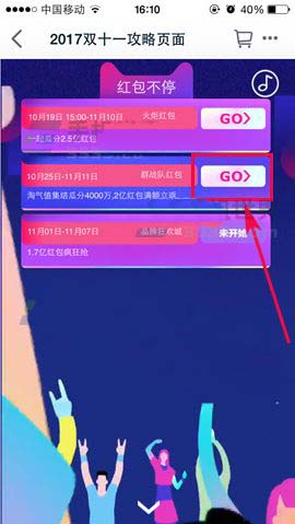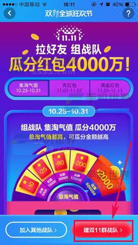 2)在红包不停页面点击【群战队红包】右边的【GO】,就会跳转到淘宝页面,再点击【建双11群战队】;(如下图)