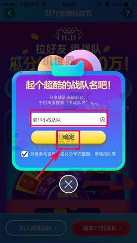 3)在方框里输入你的战队名,最后点击【确定】,双11群战队就建好了。只要拉人入战队就好了。另外,单个双11“群战队”内所有成员的淘气值总和达到相应的要求,且该战队人数≥5人,所有成员即可瓜分相应面额的双11红包奖励。若群战队内的超级会员人数≥3人的,则该战队所有成员可瓜分的红包金额翻倍。(如下图)
