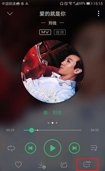 4、进去歌曲播放界面之后,点击右下方的评论图标,如下图所示: