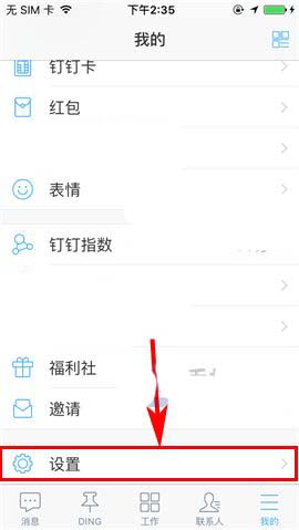 1)打开钉钉APP,首先点击“消息”界面右下角处的【我的】,然后上划界面进入【设置】;(如下图)