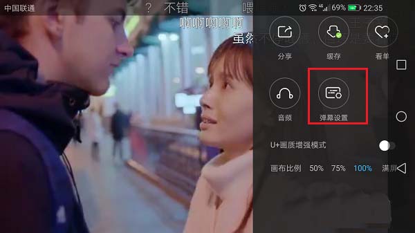 5、点击视频播放界面,选择弹幕按钮右边的列表图标,可以进行弹幕设置,如下图所示: