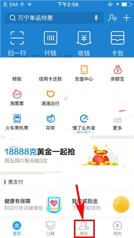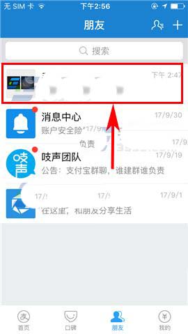 1)打开支付宝APP,首先点击首页下方的“朋友”,随后在消息列表中找到相关群;(如下图)