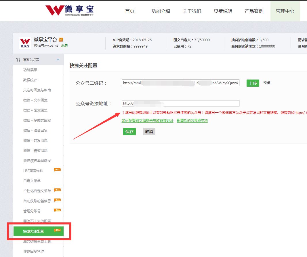 第二步:在基础功能里,开启自动获取粉丝信息和快捷关注配置,完成以后点击保存