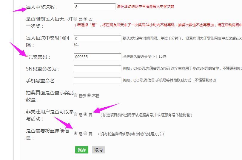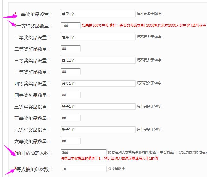 第四步:奖项设置,大转盘奖项一共6个,最重要的是预计人数设置,可以根据自己活动的情况,计算活动概率,概率是整个活动的概率。抽奖次数限制可以设置没有限制、每日限制、分享限制,设置好之后不可以修改这里的。