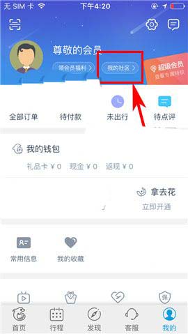 1)点开携程旅行APP,首先点击首页右下方的【我的】,然后进入【我的社区】;(如下图)