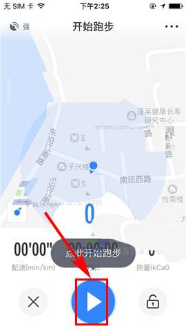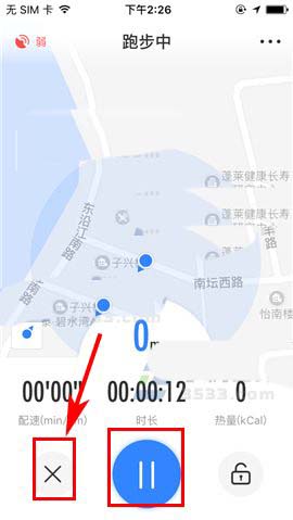 2)接着点击屏幕中箭头所指处的【开始】按键,最后在结束时再次点击该按钮并点击【x】键退出(或直接在结束时点击“x”按钮退出跑步模式)。(如下图)