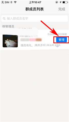 3)然后点击【设置管理】,随后在“群管理员”列表中选择相关用户,点击其后方的【管理】按钮;(如下图)