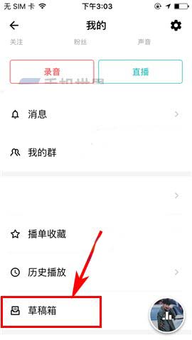 1)点开荔枝FM,首先点击首页右上角的【用户】图标,然后上划界面进入【草稿箱】;(如下图)