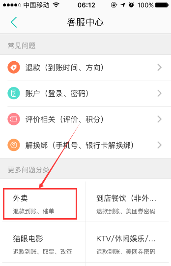 2、进入到“客服中心”页面后,此时用户有两种方法可以投诉美团外卖,第一种方法是点击此页面更多问题分类栏中的“外卖”按键。