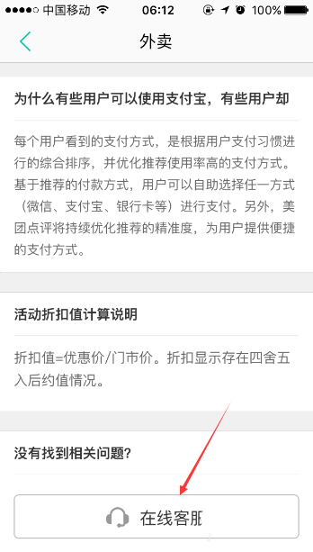 3、进入到“外卖”页面后,接着把页面下拉到最底部,然后点击“在线客服”按键。