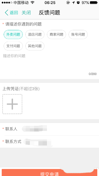 2、进入到“反馈问题”页面后,在问题描述栏中选中外卖问题,接着填写上自己遇到的有关外卖问题并上传相关凭证,之后点击“提交申请”按键,这样也能达到投诉美团外卖的目的。