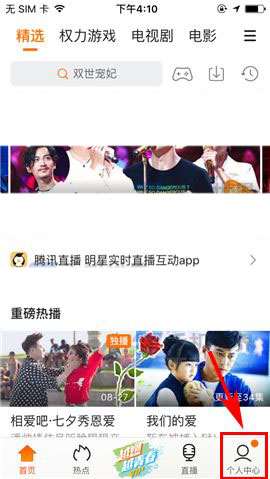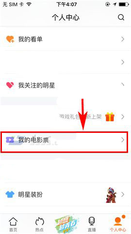 1)打开腾讯视频APP,首先进入首页右下方的【个人中心】,然后上划界面点击【我的电影票】;(如下图)