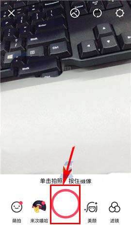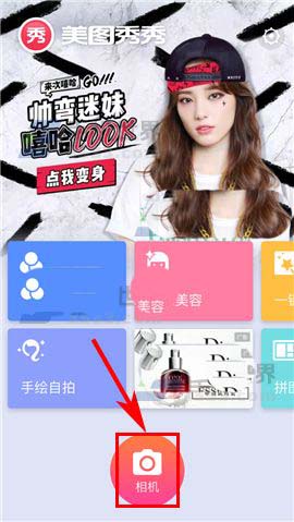 1)打开美图秀秀APP,首先点击首页中的【相机】按钮,然后【长按】屏幕中的圆形按钮录制视频,并在结束拍摄时松开按钮;(如下图)