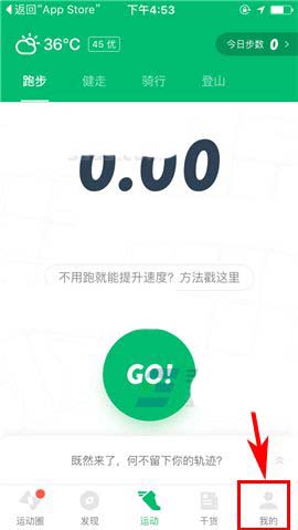 1)打开咕咚运动APP,首先点击首页右下角处的【我的】,然后点击个人用户昵称;(如下图)