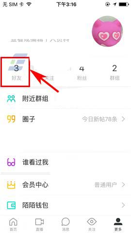 1)打开陌陌APP,首先选择首页右下方的【更多】选项,然后点击【好友】;(如下图)