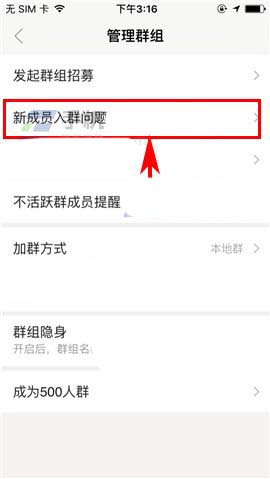 3)然后点击【管理群组】,接着再点击【新成员入群问题】;(如下图)