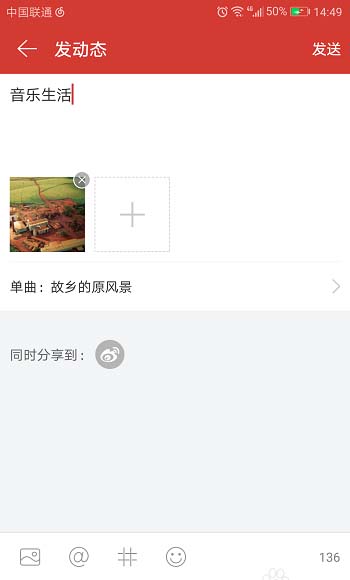 5、选择自己要发布的歌曲和内容,选择“发送”,如下图所示: