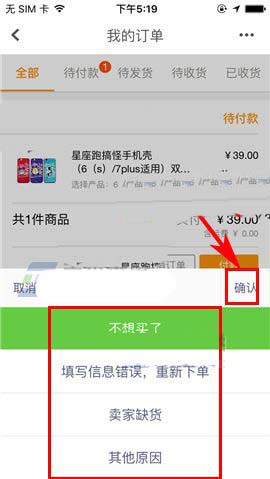 2)然后选择所要取消的相关订单,点击其下的【取消订单】,最后在选择好相关原因后点击【确认】即可。(如下图)