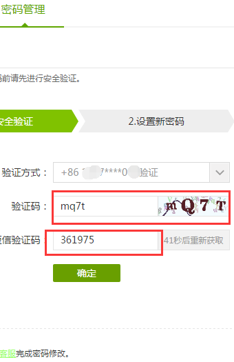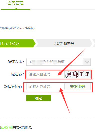4、进入修改密码界面之后会显示(如图),我们就按照提示要求填入相应的验证码和短信验证码,点击确认;