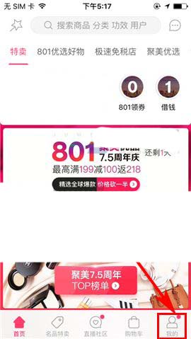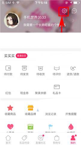 1)点开手机聚美优品,首先点击首页右下角处的【我的】,随后再点击界面右上角处的【设置】图标;(如下图)
