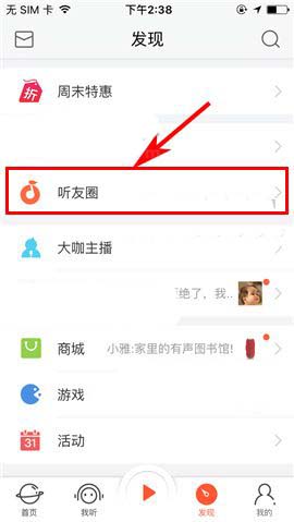 1)点开喜马拉雅FM,首先点击首页下栏中的【发现】,随后进入【听友圈】;(如下图)