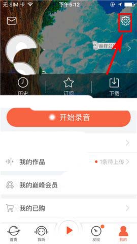 1)点开喜马拉雅FM,首先点击首页右下角处的【我的】,随后点击屏幕右上方的【设置】图标;(如下图)